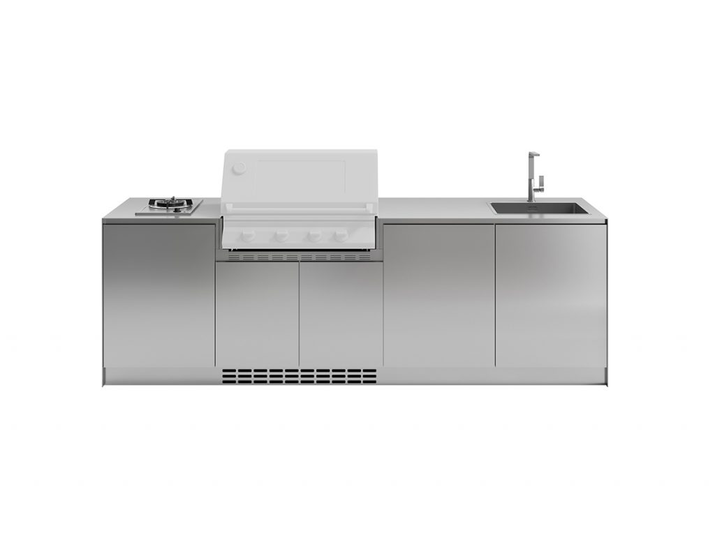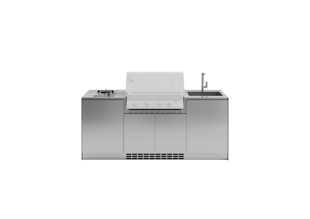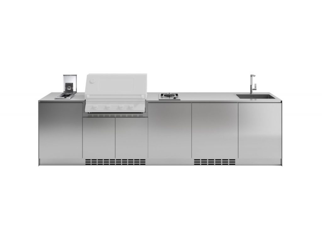 Cuisine d’extérieur en acier inox délabré complète de base vantail gauche (60cm) avec cuisinière à gaz, base à deux vantaux (90 cm) avec barbecue 4 feux, base vantail droite (60 cm) avec évier sur plan et robinet “square”. Également disponible dans la version îlot.
