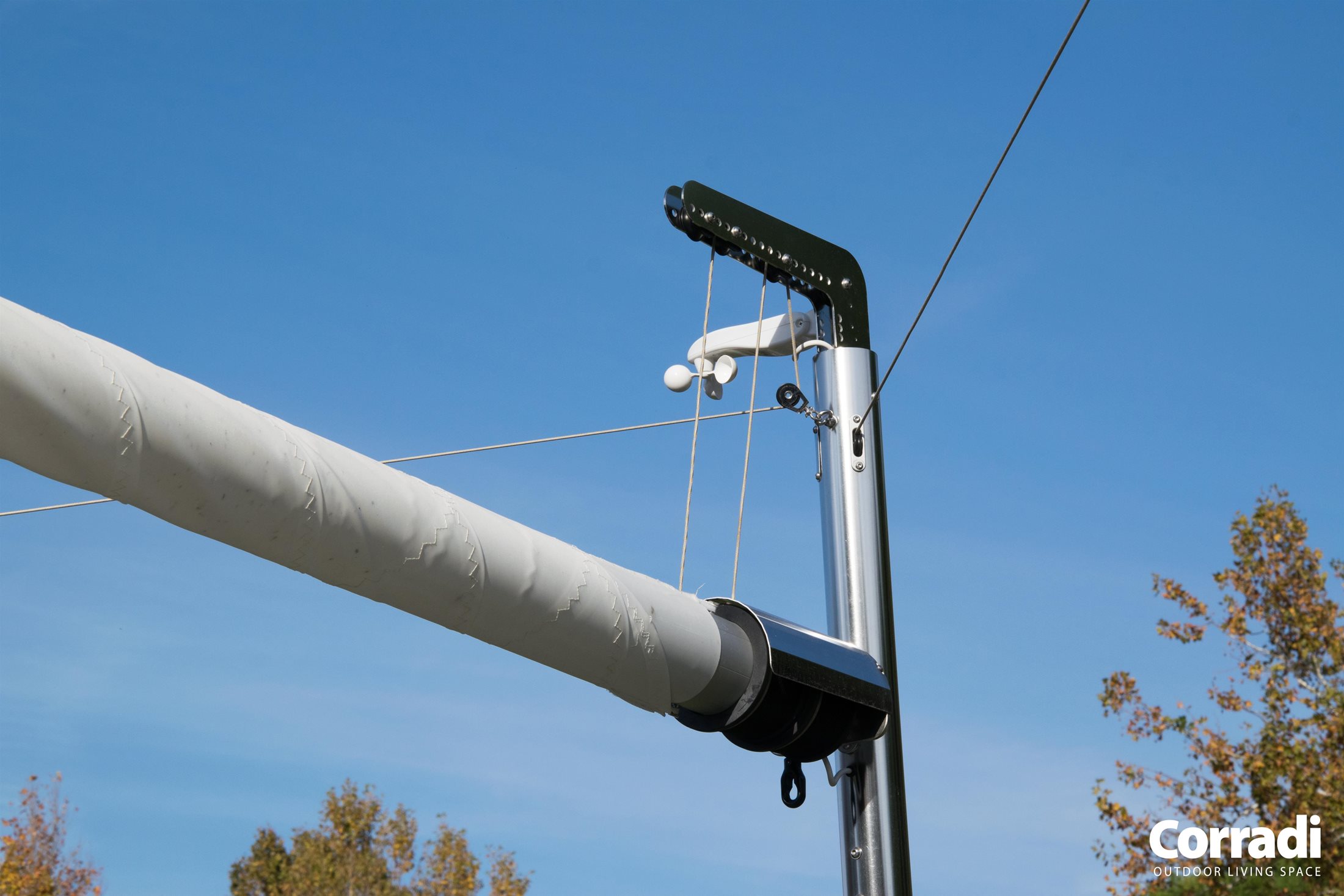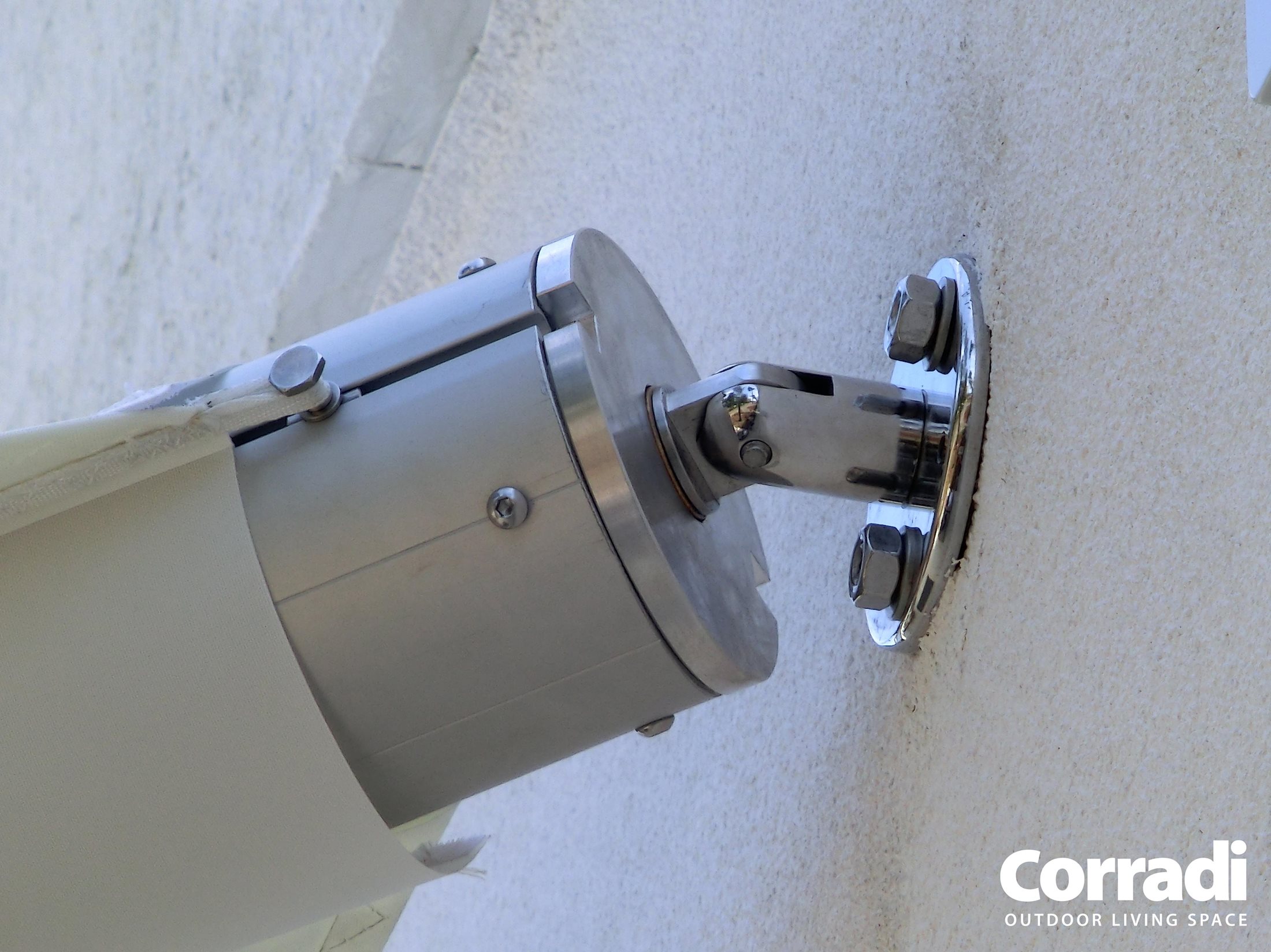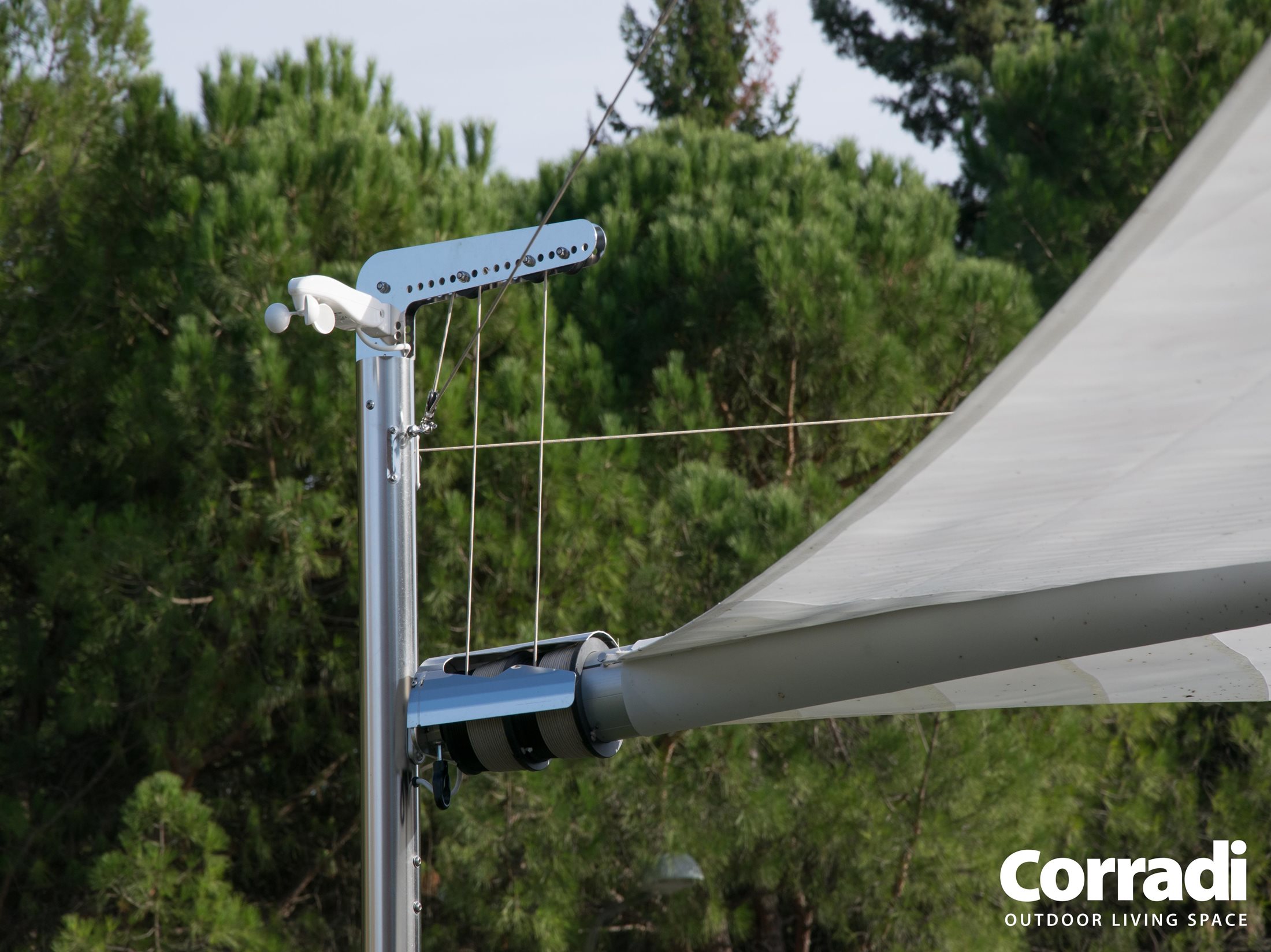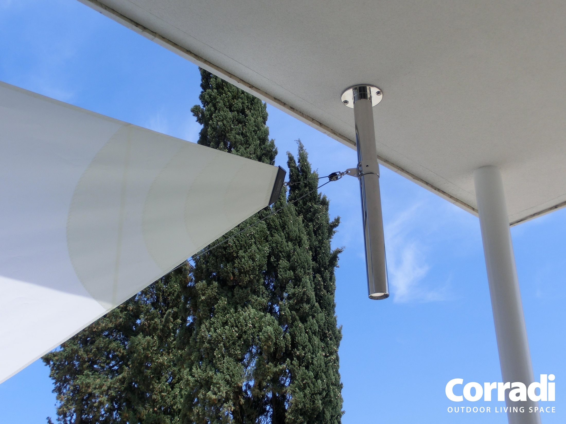 Les poteaux en acier inoxydable polis pour un effet miroir et les voiles à laizes radiales sont complétés par un moteur positionné dans le poteau enrouleur et par la présence de ressorts à l’intérieur du poteau de support.