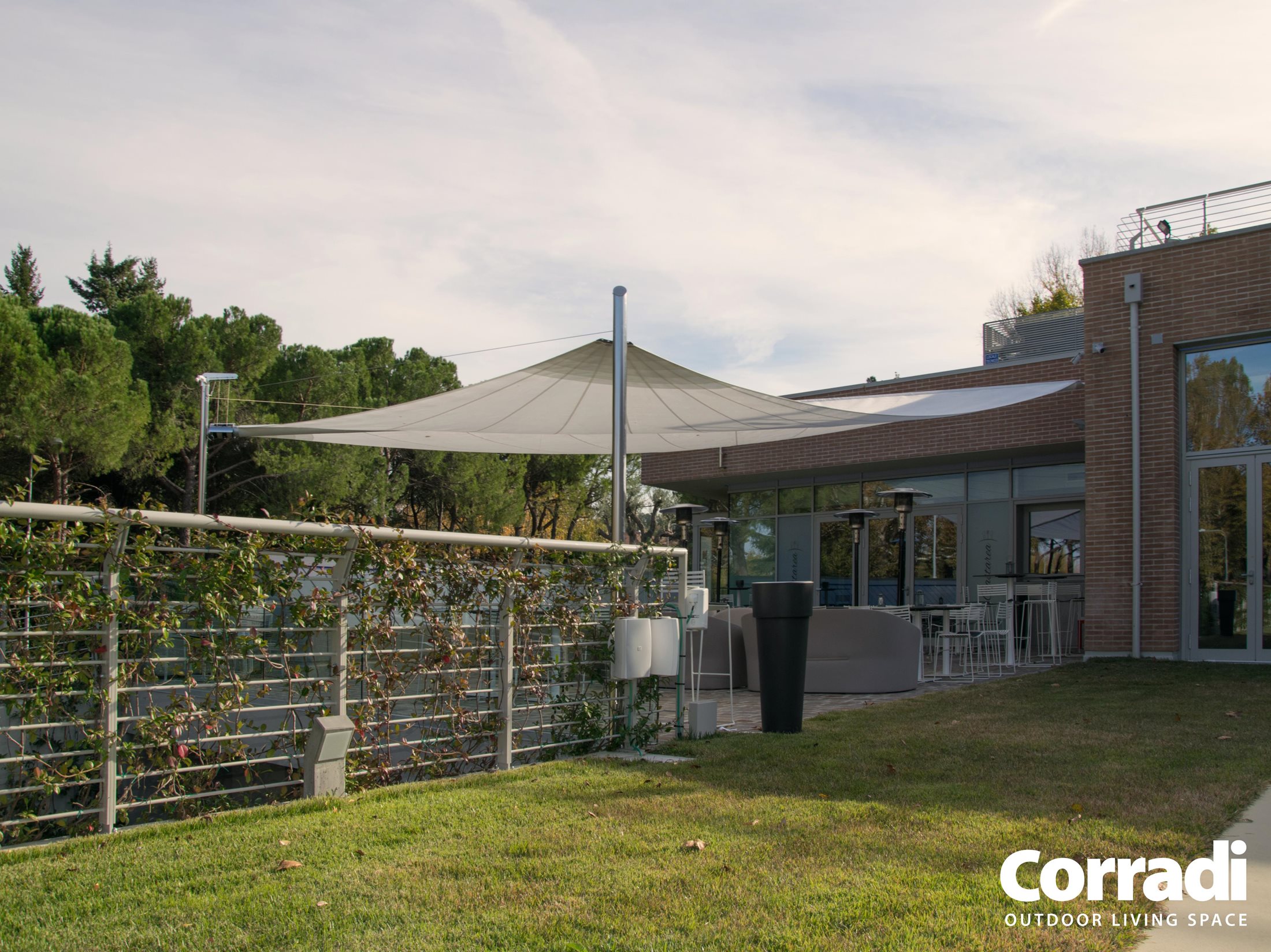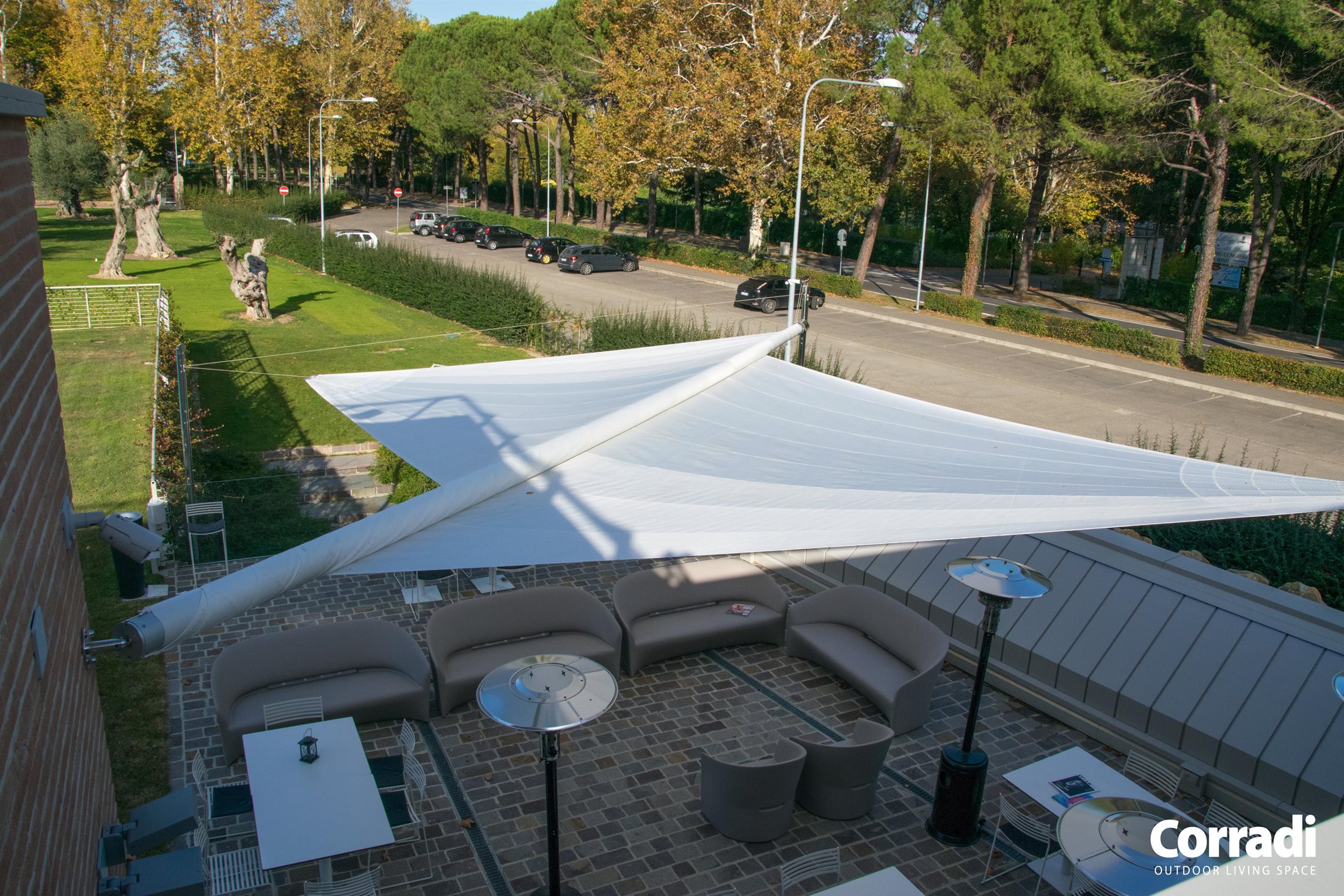 De plus, la voile, double ou simple, ne nécessite pas de contreventements et peut être fermée par le système manuel ou motorisé présent à l’intérieur du profilé enrouleur, dont la hauteur maximale est de 11 m, alors que la hauteur du triangle est de 7 m. En cas de panne de courant, le déplacement peut être manuel. Dans la version motorisée, Scirocco est équipée d’un anémomètre pour la fermeture automatique en cas de vent fort. L’entretien est également minime pour cette voile sur mesure, dont le point fort réside dans sa polyvalence d’installation.